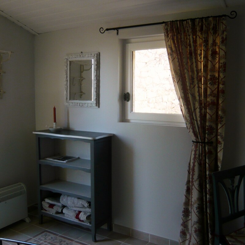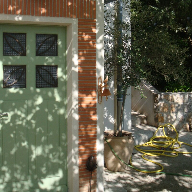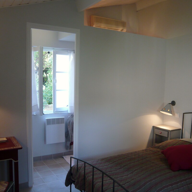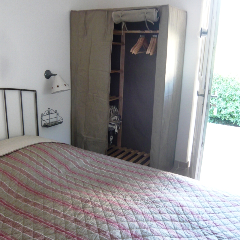 Vom Garten aus gelangt man durch einen externen Eingang zu einem Gästezimmer mit Doppelbett und Klimaanlage sowie einem Duschbad mit Waschtisch und WC.