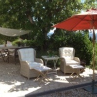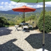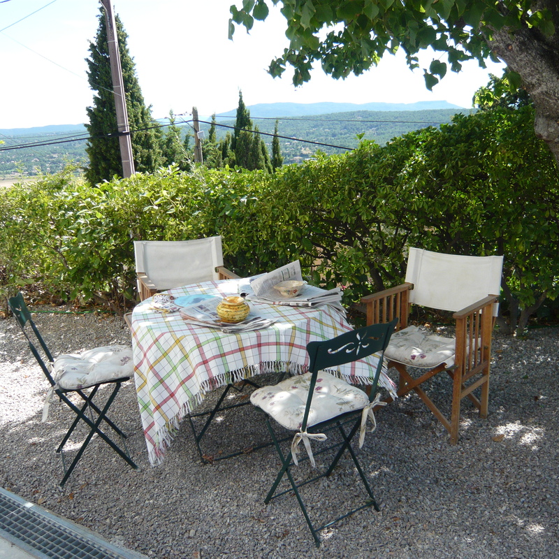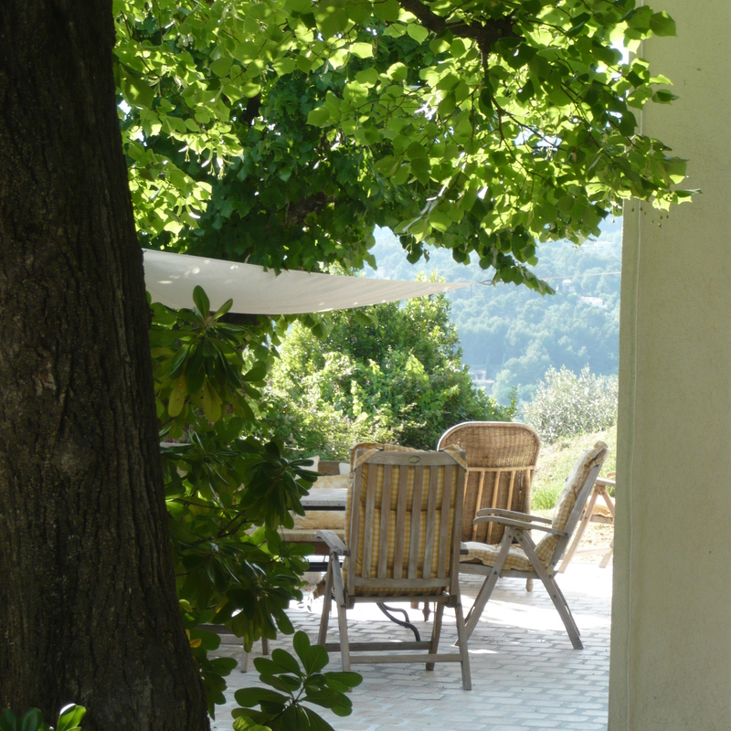 Auf der Terrasse vor dem Haupthaus, unter den schattenspendenden Lindenbäumen, steht ein großer Esstisch für 6-8 Personen. Sonnenliegen und -schirme stehen Ihnen zur Verfügung.